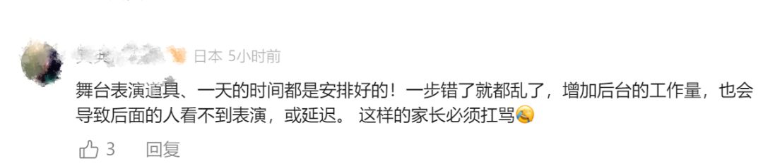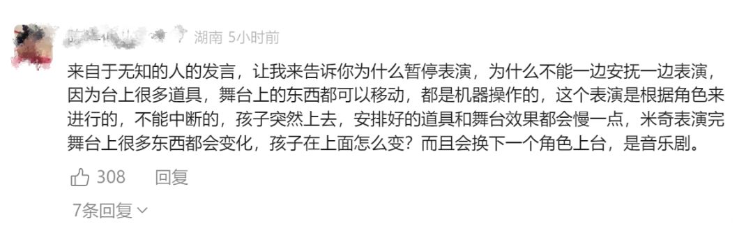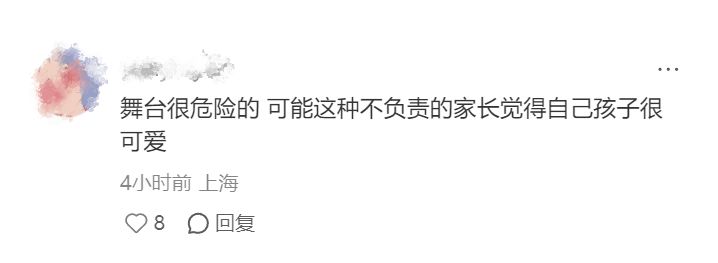 据知情人士周女士称,孩子看起来五六岁,可能是家长怂恿上台,最后孩子和家长被带离,设备调试后,演出继续。